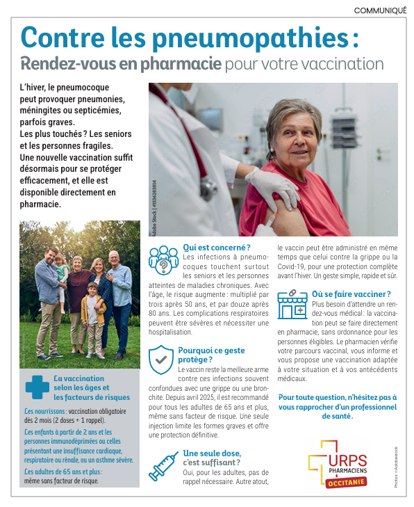 Dans le cadre de la campagne de communication Grand Public menée par votre URPS Pharmaciens, retrouvez ci-joint les publi-rédactionnels sur la vaccination contre le pneumocoque parus dans les magazines Télé7Jours du 10 novembre (cliquez ici) et Paris-Match des 6 et 13 novembre (cliquez ici), en Occitanie.