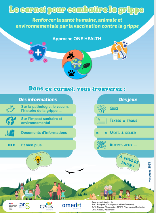 Sous l'égide de l'ARS Occitanie, votre URPS Pharmaciens a participé, en collaboration avec le CPias et l'OMEDIT, à un groupe de travail pluridisciplinaire régional afin de travailler sur la co-construction d'unoutil pédagogique pour sensibiliser à la grippe, à son impact humain, animal et environnemental, et au rôle clé de la vaccination dans une approche One Health.