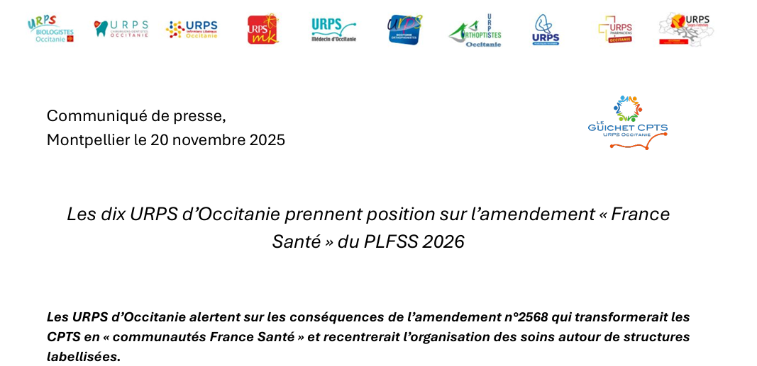Via ce communiqué, les dix URPS d’Occitanie alertent sur les conséquences de l’amendement n°2568 qui transformerait les CPTS en « communautés France Santé » et recentrerait l’organisation des soins autour de structures labellisées.
